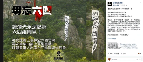 社民連在當天早上於fb指出,社民連義工為悼念六四亡魂,再次於筆架山掛上巨型直幡,呼籲香港人出席六四維園燭光晚會。社民連副主席黃浩銘又呼籲,不要忘記六四、不要停止悼念、不要停止平反,呼籲六四維園見。[25]