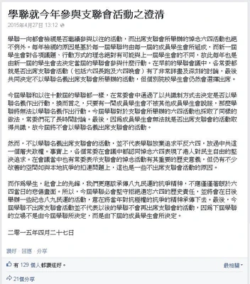 由2015年初起,香港專上學生聯會因有大專成員不滿其雨傘革命期間表現,紛紛發起相繼退聯公投,學聯至六四紀念期間只剩四間大專代表。學聯與泛民緊扣的現況備受非議,其追求「民主中國」的訴求,亦被斥和大專學生普遍「關心香港」的期望相左。2015年4月27日,學聯在facebook專頁發表聲明,共同決定不以學聯名義出席支聯會所舉辦的六四活動。這將會是26年來學聯首次缺席支聯會的維園燭光集會。學聯於聲明中強調,不以學聯名義出席支聯會的活動,並不代表學聯放棄追求平反六四,今屆學聯必會堅守拒絕遺忘六四的歷史責任。其後不少學聯成員表示將會以個人名義出席活動。