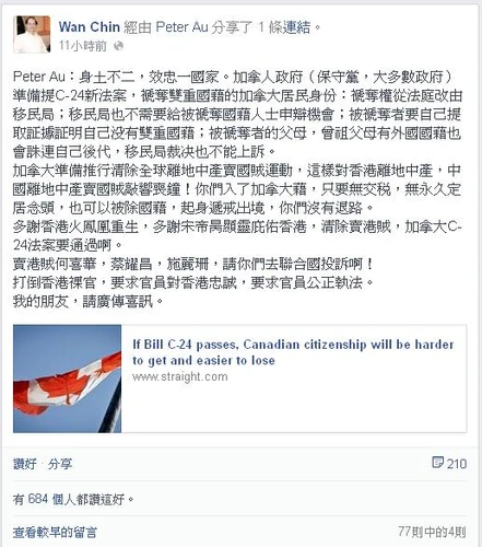 2014年5月中旬,有網民翻譯轉載外文報導,指加拿人政府準備提新法案,褫奪雙重國藉的加拿大居民身份: