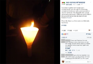2016年6月4日,六四事件二十七週年當天晚上,加拿大駐香港及澳門總領事館貼出一幅燭光的照片,寫道:「在對人權、良善管治和法治堅定不移的承諾下,加拿大人與香港人一同紀念六四。」又指「我們仍然記得那在1989年所見證過的勇氣和堅韌,並團結一致地追求民主發展和自由。」[18]有媒體指加國領事此舉動,是和王毅早前的無視外交禮節舉動有關。