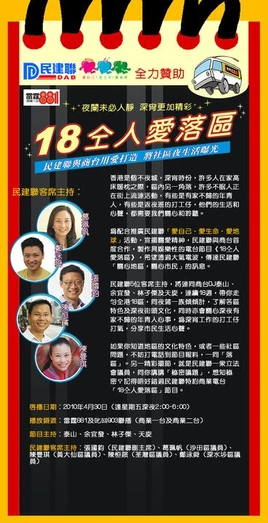 在2010年4月28日,傳媒報導指商業電台宣佈把未來四個月合共72小時的深宵節目時段售予民建聯。由5月1日起連續18個星期六凌晨2時至6時,商業一台及二台會聯播《十八仝人愛落區》節目,該節目由民建聯贊助,取代《一切從音樂開始》,五名民建聯成員鄭泳舜、張國鈞、葛珮帆、陳曼琪及陳恒鑌將擔任客席主持,並聯同商台主持到訪18區夜蒲點探訪夜青。
