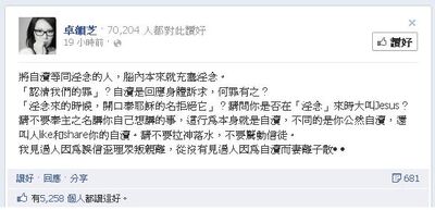 - ↑ Facebook卓韻芝:「淫念來的時候,開口奉耶穌的名拒絕它」?請問你是否在「淫念」來時大叫Jesus?