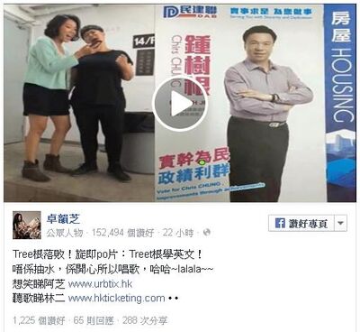 - ↑ 卓韻芝 fb專頁:Tree根落敗!旋即po片:Treet根學英文!,2015年11月24日