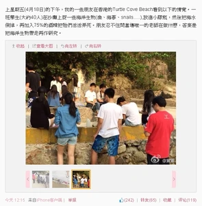 2014年4月下旬,宣萱於微博指有朋友在沙灘遇見一群中學生,將魚及蝸牛等海洋生物以酒精弄死,在場的老師則表示帶回去學校做研究。他留言指責這種行為:「一班中學生,每人捉了一至兩種生物,共殺了大約80條生命。牠們死得非常痛苦,因被75%酒精弄死。」、「這是現在的教育方式嗎?我們不是應該保護大自然的嗎?我和我的朋友真的想不通。」此微博一出,網民反應各異,有網民指學生只是做普通研究,質疑宣萱小題大作;但亦有網民表示學生濫殺無辜,破壞大自然生態。不過更有網民指宣萱公開學生的樣貌,做法不對。[4]