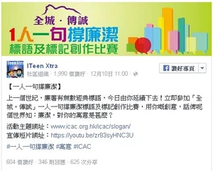 - ↑ ITeen Xtra fb page: 【一人一句撐廉潔】,2015年12月10日 11:00