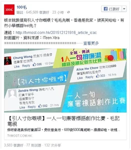 - ↑ 100毛fb專頁:根本就裝個局引人寸你嘅喂?毛毛先喇,香港是我家,狼英笑哈哈,有冇小學標語feel先?,2015年12月12日