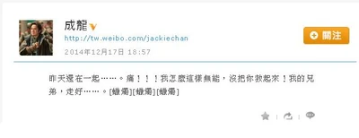 - ↑ 成龙的微博:昨天还在一起……。痛!!!我怎么这样无能,没把你救起来!我的兄弟,走好……。,2014年12月17日 18:57