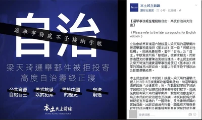 - ↑ Facebook:本土民主前線:【選舉事務處濫權踐踏自由,高度自治消失殆盡】
