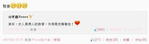 - ↑ 何超蓮Laurinda的微博:賢妻 @李蘊Renee 其实,女人是男人的肋骨,作用是支撑着他!,2014年 4月15日 03:10