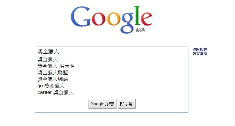 在google鍵入「獎金獵人」後,所彈出的搜尋提議。