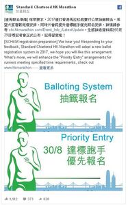 - ↑ Standard Chartered HK Marathon fb專頁:[渣馬報名準備 徇眾要求,2017渣打香港馬拉松將實行公眾抽籤報名,希望大家喜歡呢個安排...],2016年8月19日
