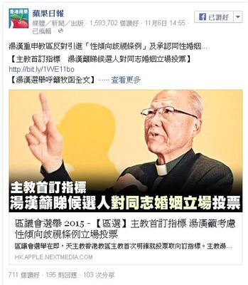 - ↑ 蘋果日報fb專頁:湯漢重申教區反對引進「性傾向歧視條例」及承認同性婚姻… 【主教首訂指標 湯漢籲睇候選人對同志婚姻立場投票】,2015年11月6日 14:55