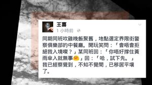 曾經當過警察的王喜,在facebook分享1986年他在警察學堂受訓的經歷。他憶述當時教官的訓話是粗口交集,教官直言警察應放下尊嚴,而他們到此只是為了執行法律給予的權力。