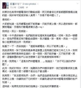 王喜表示最後在其他安檢人員檢查了路由器的電流量後,因沒有超過限制流量,便歸還了給他,最後成功登機。他其後更指,本來只是小事一件,但機場安檢人員卻因為香港人說了一句「你們中國」這句咒語,便啟動了他們的愛國防衛系統。