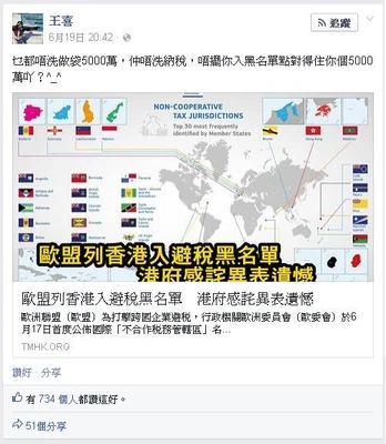 - ↑ 王喜 fb: 乜都唔洗做袋5000萬,仲唔洗納稅,唔擺你入黑名單點對得住你個5000萬吖?^_^,2015年6月19日 20:42