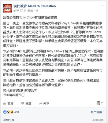 - ↑ 蘋果日報fb專頁:現代教育傍晚在官方fb宣佈,5月12日已暫停與Tony Chow的合作。,2016年5月20日
