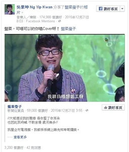 - ↑ 盤菜瑩子fb專頁:【毛毛強行佔領些牙】喂唱到聲帶都受埋傷你唔係唔聽呀?,2016年5月11日。