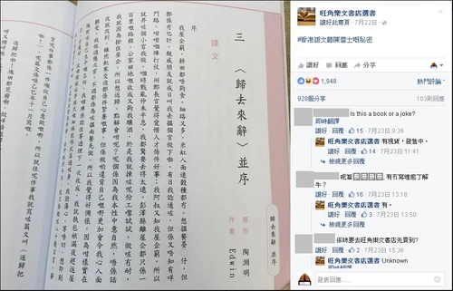 旺角樂文書店就在facebook專頁貼出書中將其中一首文言文《歸去來辭》,翻譯成廣東話的內容。「余家貧,耕植不足以自給。幼稚盈室,缾無儲粟。」重寫成「我屋企窮,耕田都唔夠食。細路又多,米缸入面連穀種都冇。」;「因事順心,命篇曰《歸去來兮》。乙巳歲十一月也。」重寫成「辭官呢件事都係一件順從自己心意做嘅嘢,所以就住呢件事我就寫咗篇文叫《返歸把啦!》。呢篇文係喺乙已年十一月寫嘅。」