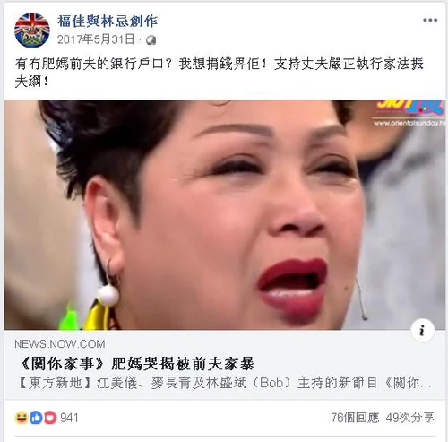 2017年5月下旬,肥媽在無綫節目《關你家事》中,自爆曾遭菲律賓籍前夫家暴,說得聲淚俱下,非常感人。可是網民沒有被她感動,更紛紛作出喜氣洋洋的歡呼聲。