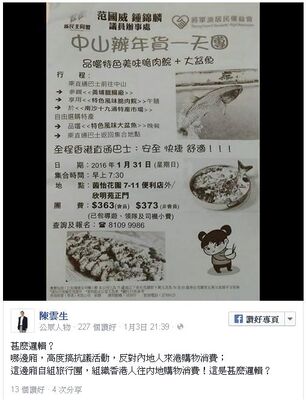 - ↑ 明報即時新聞fb專頁:【辦團惹爭議】根據宣傳單張,范國威的年貨團今個月尾舉行,由香港搭直通車上中山...,2016年1月4日