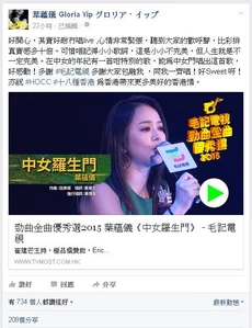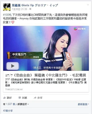 - ↑ 葉蘊儀 Gloria Yip グロリア・イップ fb專頁:#100毛 下次玩D咁的事比D時間我練下先,這個突然會嚇親姐姐我同埋毛孩的讀者。Anyway 你地認真的工作態度和靈活的腦袋是令姐姐非常欣賞!,2015年7月28日 21:28