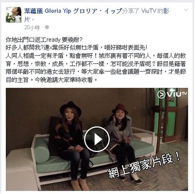 - ↑ 葉蘊儀 Gloria Yip グロリア・イップ fb專頁:...好多人都問我?連x葉係好似無乜矛盾,唔好睇咁表面先!...,2016年4月25日