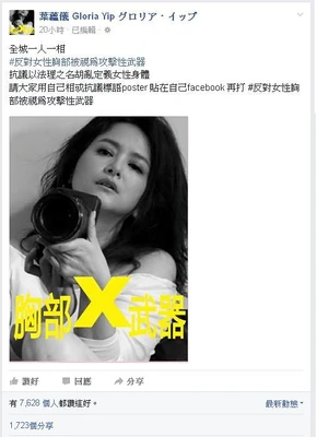 - ↑ 葉蘊儀 Gloria Yip グロリア・イップ fb專頁:全城一人一相 #反對女性胸部被視為攻擊性武器 抗議以法理之名胡亂定義女性身體...,2015年7月30日