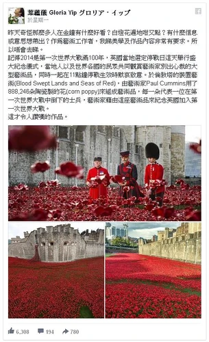 葉蘊儀劈頭一句就問:「奇怪那麼多人在金鐘有什麼好看?」從事藝術創作的她表示,作品的訊息比純粹視覺效果更為重要,問:「白燈花遍地咁又點?」她又以 2014 年英國紀念第一次世界大戰結束 100 周年,藝術家 Paul Cummins 在倫敦塔下製作名為 Blood Swept Lands and Seas of Red 的裝置為例。相對英國的「花海」,藝術家以 888,246 朵陶瓷花代表每一名當年戰死的士兵,作為和平的紀念,她質問金鐘花海「有什麼信息或意思想帶出?」