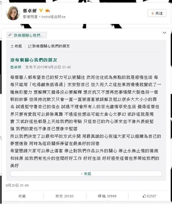 - ↑ 蔡卓妍的微博:致每個關心我們的朋友,2015年9月20日 01:48