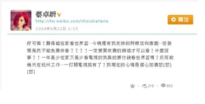 - ↑ 蔡卓妍的微博:好可憐!難得能在家看世界盃⋯今晚還有我支持的阿根廷和德國⋯但發現竟然不能免費收看...,2014年6月22日 01:25