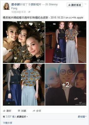2015年10月23日,英皇集團主席楊受成與太太陸小曼舉行慶祝結婚30周年(珍珠婚)派對,眾多明星名人出席道賀。蔡卓妍在facebook發帖,張貼出席派對時的相片,又留言指「楊受城夫婦結婚30週年珍珠婚紀念派對」,但把「楊受成」寫成「楊受城」,有網民留言指「老闆個名都寫錯」。