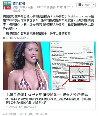 - ↑ 明報即時新聞 fb專頁:【一切如常】報道指蔡思貝的媽媽被指隱瞞親屬關係寫推薦信,推薦蔡思貝報讀碩士課程。,2015年12月3日