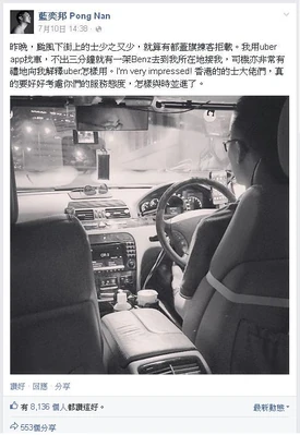 - ↑ 藍奕邦 Pong Nan fb專頁:昨晚,颱風下街上的士少之又少,就算有都蓋旗揀客拒載。我用uber app找車,不出三分鐘就有一架Benz去到我所在地接我...,2015年7月10日