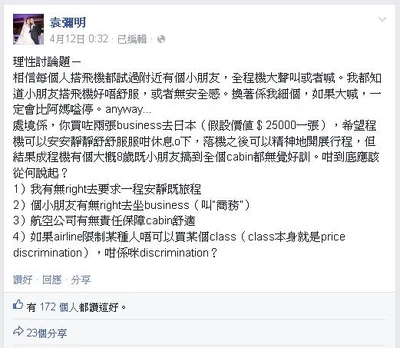 與此同時,剛巧有人在空姐空少聚集地CX Secrets facebook張貼了類似意見,問道:「為甚麼國泰要賣商務票給小孩,令其他客人受罪?那我下次坐經濟艙不也是一樣嗎?」有人在facebook留言,指相信提出這個問題的,應該是袁彌明本人。