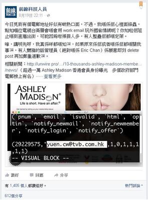 2015年8月中旬,已婚者交友網站「Ashley Madison」遭黑客入侵,超過9GB的用戶姓名、電郵等資料遭公開,外洩名單當中有「.hk」作結尾的電郵地址,更有香港政府域名的「.gov.hk」及教育界的「.edu.hk」。