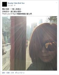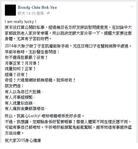 - ↑ Bondy Chiu Hok Yee的facebook專頁:I am really lucky ! 原本沒打算公開的私事,經過幾日各方好友探訪慰問提意見,在討論中大家都說我老人家非常幸運...,2015年1月4日