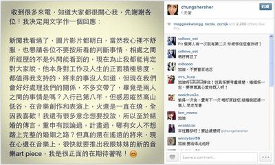 - ↑ chungshersher's instagram:收到很多來電...,2015年2月26日