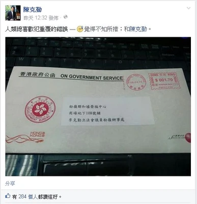 2015年4月10日,陳克勤在facebook個人專頁上載一張圖片,內容是政府部門寄給他的信件上寫了「李克勤立法會議員」,他不禁慨嘆「人類總喜歡犯重覆的錯誤」,又表示「不知所措」。[20]