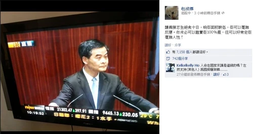 梁振英表現得若無其事,其冷漠態度受到網民痛斥。杜汶澤更在Facebook出帖指責他「100%廢」、「毫無人性」。[6]