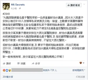 fb專頁「HA Secrets」繼爆出民建聯譚耀宗被指「宗割特瘜」後,該專頁再在2016年6月6日貼文指出,「保皇黨蚊怕水議員」太太入院產子安排入住頭等私家病房,又主動要求高層特事特辦,由指定顧問醫生主診,全程盡享私家千億新抱貼身服務,最終收費為每日100元。