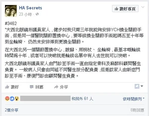 2016年7月4日,fb 專頁「HA Secrets」又爆料,指「大西北眼鏡布議員家人」只需等3年,就能夠安排到仁濟醫院做換關節手術,該專頁稱同一醫院關節置換中心,要等候換全關節手術起碼要5至10年,有些甚至等到坐輪椅,仍然未安排得到更換全關節。