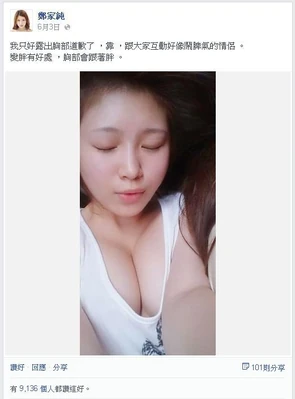 2014年6月,雞排妹宣佈和先前虐打他的男友復合,網民表示不能接受。結果她在facebook張貼了一張半露胸部的照片,向網民道歉,說:「我只好露出胸部道歉了,靠,跟大家互動好像鬧脾氣的情侶。變胖有好處,胸部會跟著胖。」不少網民表示樂意接受。[19]