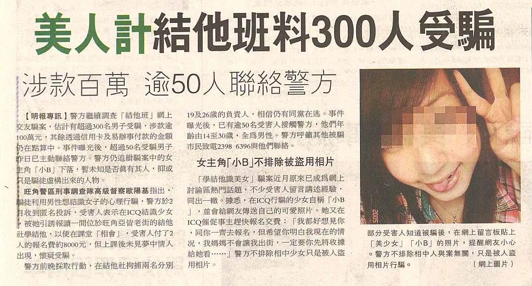 美人計結他班料300人受騙 涉款百萬 逾50人聯絡警方 【明報專訊】警方繼續調查「結他班」網上交友騙案,估計有超過300名男子受騙,涉款逾100萬元,其餘透過信用卡及易辦事付款的金額仍在點算中。事件曝光後,超過50名受騙男子昨日已主動聯絡警方。警方仍追緝騙案中的女主角「小B」下落,暫未知是否真有其人,抑或只是騙徒虛構出來的人物。 旺角警區刑事調查隊高級督察歐陽基指出,騙徒利用男性想結識女子的心理行騙,警方於2月收到匿名投訴,受害人表示在ICQ結識少女,被她引誘報讀一間位於旺角亞皆老街的結他社學結他,以便在課堂「相會」,受害人付了2人的報名費約8000元,但上課後未見夢中情人出現,懷疑受騙。 警方前晚採取行動,在結他社拘捕兩名分別19及26歲的負責人,相信仍有同黨在逃。事件曝光後,已有逾50名受害人接觸警方,他們年齡由14至30歲,全為男性。警方呼籲其他被騙市民致電2398 6396與他們聯絡。 女主角「小B」不排除被盜用相片 「學結他識美女」騙案近月原來已成為網上討論區熱門話題,不少受害人留言講述經驗,同出一轍。據悉,在ICQ行騙的少女自稱「小B」,並會給網友傳送自己的可愛照片。她又在ICQ催促事主趕快報名交費﹕「我都好想見你,同你一齊去報名,但希望你明白我現在的情况,我媽媽不會讓我出街,一定要你先將收據給她看……」警方不排除相中少女只是被人盜用相片。 |