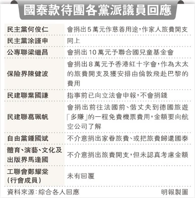 - 何俊仁及涂謹申:民主黨涉事議員涂謹申事後辯稱只是「因利乘便」,何俊仁亦指「不覺得議員出席目的是接受款待」,兩人均未即時就事件道歉。民主黨中常會前晚開會後,直指何、涂兩人接受國泰「過份慷慨」款待,屬行為不恰當兼違反黨規,黨主席劉慧卿就事件向公眾道歉。不久何、涂終發表聲明認衰,稱經兩天反思後,明白長期習以為常的行為,就算以往社會無異議,並不等於該行為是對,「因此我們應要有足夠的政治敏感度」。兩人表示願向公眾表示歉意,每人將向國泰建議的慈善基金捐贈五萬元,作為家人參與是次旅程的開支。[11]