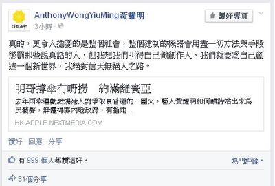 - ↑ AnthonyWongYiuMing黃耀明的facebook專頁:真的,更令人擔憂的是整個社會,整個建制的機器會用盡一切方法與手段懲罰那些說真話的人...,2015年3月17日