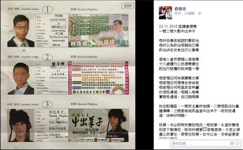 - ↑ 莊偉忠的fb專頁:22.11.2015 區議會選舉 一號二號大戰中出羊子...,2015年11月22日