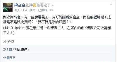 - ↑ 梁金金fb:剛收到消息,有一位助選義工,有可能因為幫金金,而被無理解僱!這樣是不是秋後算賬?!算不算是政治打壓?!...,2015年11月24日