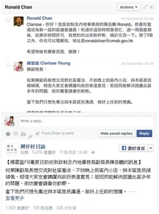 - ↑ 灣仔好日誌fb專頁:楊雪盈FB專頁日前收到政制及內地事務局副局長陳岳鵬的訊息,2015年11月28日
