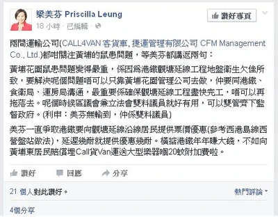 - ↑ 梁美芬fb專頁:兩間運輸公司(CALL4VAN 客貨車, 捷運管理有限公司 CFM Management Co., Ltd.)都咁關注黃埔的鼠患問題,等美芬都講返兩句...,2015年11月24日