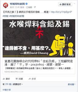 - ↑ 明報即時新聞 fb專頁:【手民之誤?】網民似乎唔係好信喎.......富嘉花園換喉合約列明焊料「含鉛」 工程顧問澄清﹕漏了「不」字,2015年8月5日